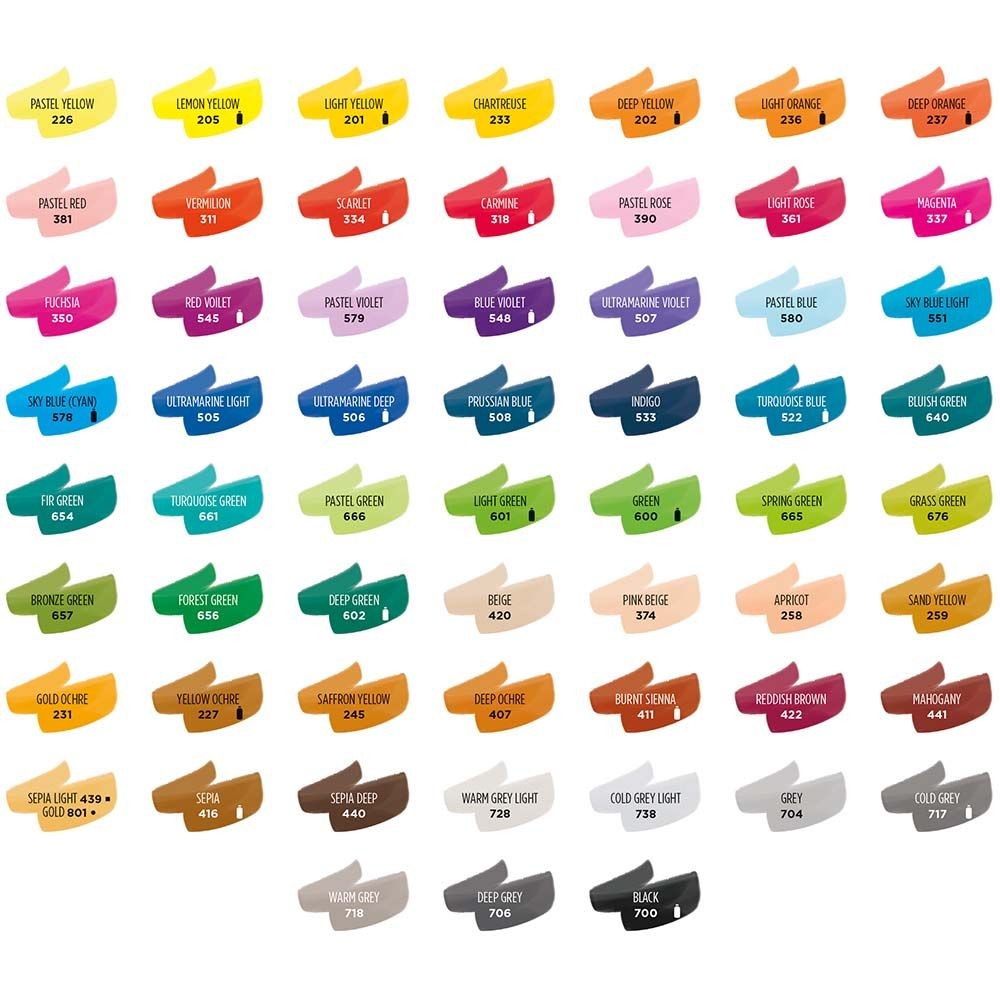 The new Talens Ecoline Brush Pen is very user friendly. Handy when travelling and ideal when working at a place that needs be kept clean. The Brush Pen is ready for immediate use, and, what’s more, odourless. You can use the Brush Pen for thin, precise lines or for energetic strokes, but also for filling in large colour sections. The Brush Pen is suitable for both a quick sketch and adding the finishing touches. For technical reasons, the formula of Talens Ecoline in the Brush Pens is much more concentrated than that in the bottles. The combination of both products ensures for a seamless transition of the colours.