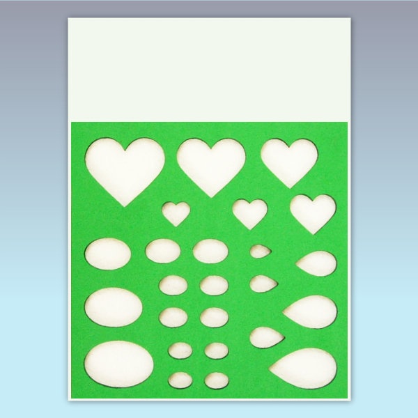 Sablon 10-35 mm-es méretű, szív, csepp és ovális formákkal.